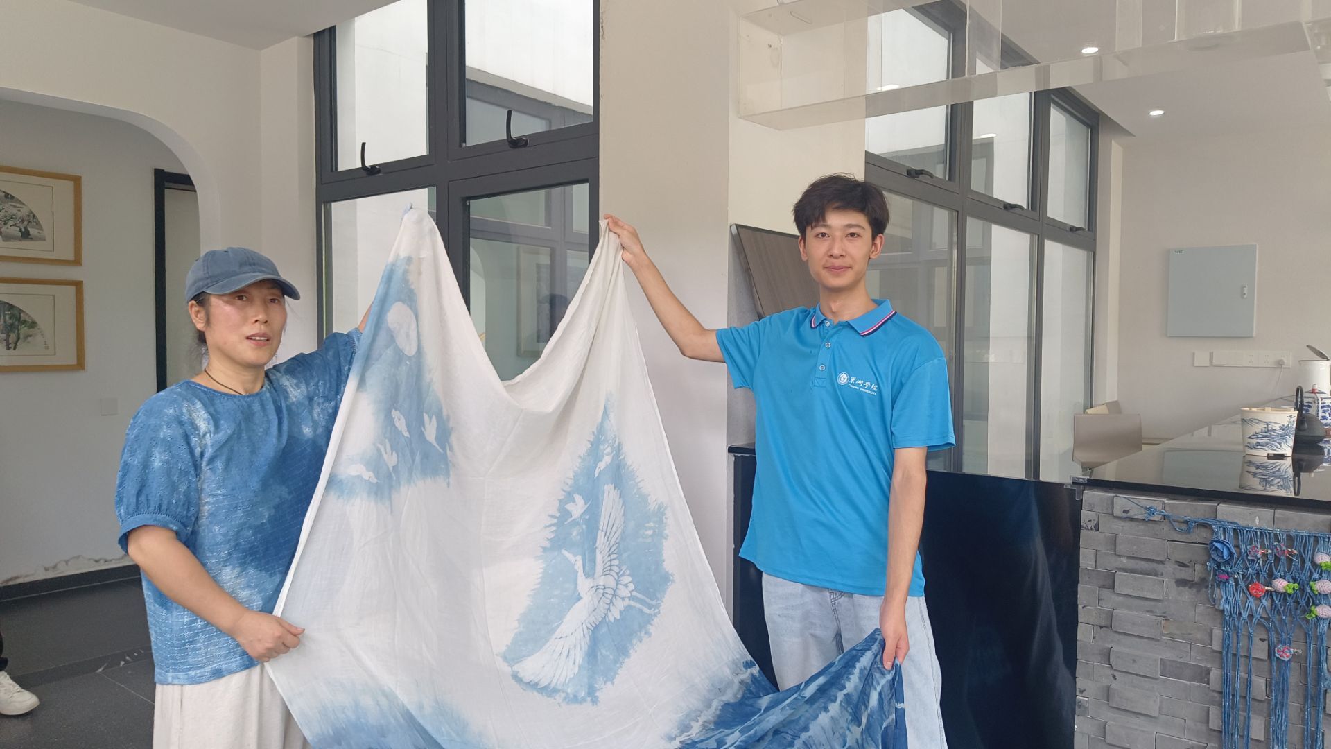 下午4時,實踐團前往圩壹森境,聚焦非遺傳承,在圩壹森境體驗了藍染、扎染、剪紙等多項非遺技藝,體驗“非遺活化”與“鄉(xiāng)村文旅”的實踐課題。在藍染基地,實踐團隊與非遺傳承人共同創(chuàng)作了具有現(xiàn)代審美的藍染作品。從染料制備到圖案設(shè)計,隊員們深刻體會到傳統(tǒng)工藝的市場價值。通過親身體驗傳統(tǒng)技藝,實踐團成員認識到傳統(tǒng)工藝需要當代表達,藍染不僅是技藝,更是一種生活美學的傳承。剪紙傳承人安老師更是在教學時說道:"這些工藝看似簡單,實則蘊含著深厚的文化內(nèi)涵。"團隊成員王文琪在體驗后感慨:"每一道工序都需要耐心和技巧,讓我對傳統(tǒng)手工藝有了新的認識。"