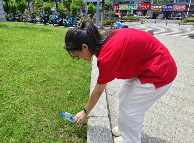 在確認老人們滿意離場之后,隊員們發現還有充裕的時間,有人提議清理一下社區垃圾,于是隊員們自發分組,走進綠化帶、小廣場、樓道口,撿拾起被隨意丟棄的塑料瓶、食品包裝袋與煙頭等垃圾,并嚴格按照可回收、不可回收、有害垃圾的標準進行分類投放。夏日的烈日烘烤著大地,隊員們的衣襟很快被汗水浸濕,但沒有人抱怨退縮,反而干勁十足。