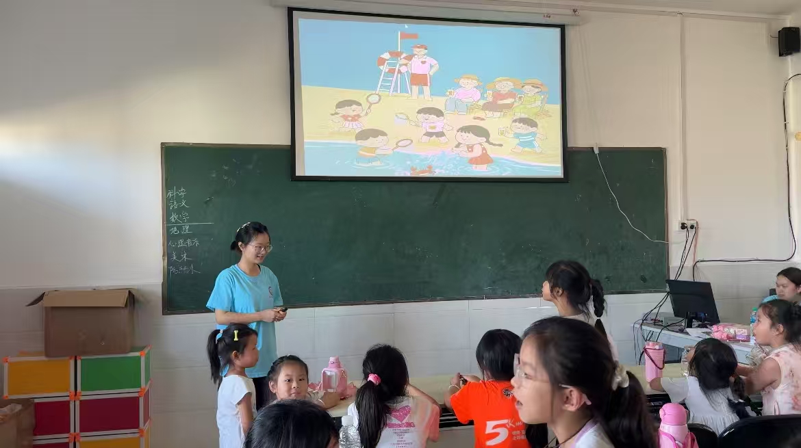 抵達當地后,實踐隊徑直走進教室,有序布置宣講場景。為讓知識傳遞更生動,隊員們調試動畫播放設備、擺放防溺水知識卡片,將教室營造成趣味與知識交融的小課堂。