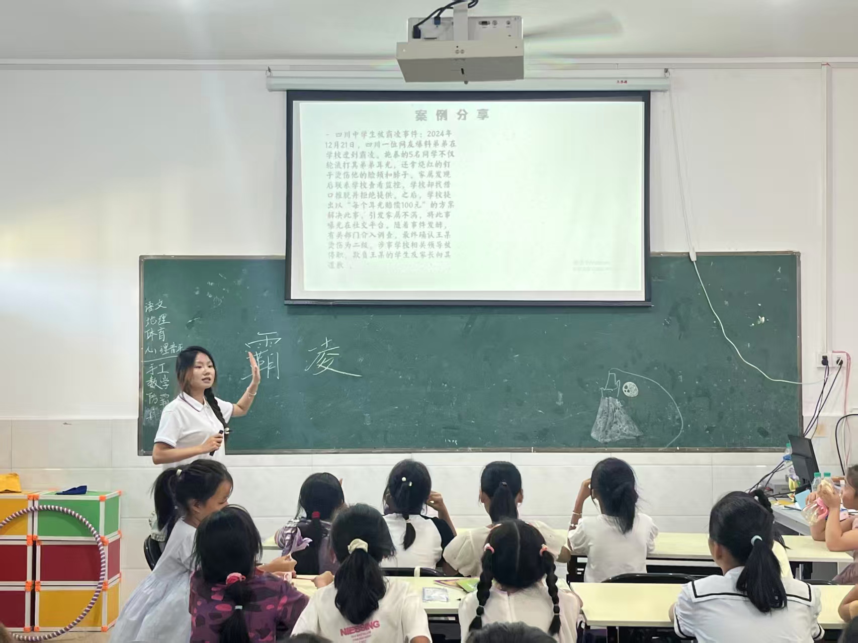 “小朋友們,你們知道哪些行為是校園霸凌嗎?”活動開始,實踐隊隊員就以提問的方式引發孩子們思考。通過播放視頻的形式,讓小朋友們清楚校園霸凌的形式:肢體沖突、言語侮辱、孤立排擠等,讓孩子們直觀認識到霸凌的多種形式。“推搡、罵人、故意不給別人玩,這些都是不對的,會給別人帶來很大的傷害。”實踐隊隊員的講解讓孩子們對霸凌有了清晰的認知。