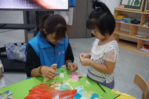 手工環節,志愿者準備彩紙、竹簽、膠水等材料,帶領孩子們制作個性化小雨傘。在學習傘面結構搭建時,孩子們發揮奇思妙想:有人用彩筆繪制卡通動物圖案,有人寫下“盼爸爸媽媽回家”的心愿。