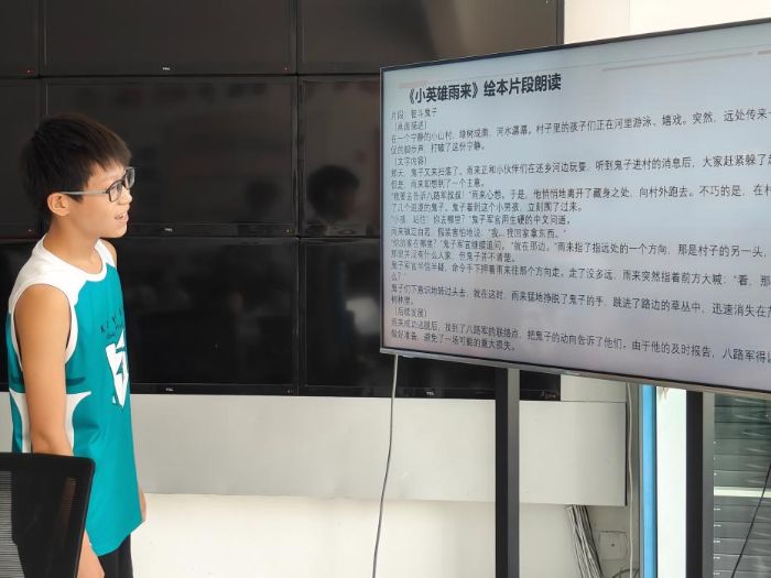 圖為在麥樓社區(qū),孩子朗讀《小英雄雨來》經(jīng)典片段。包程藝攝