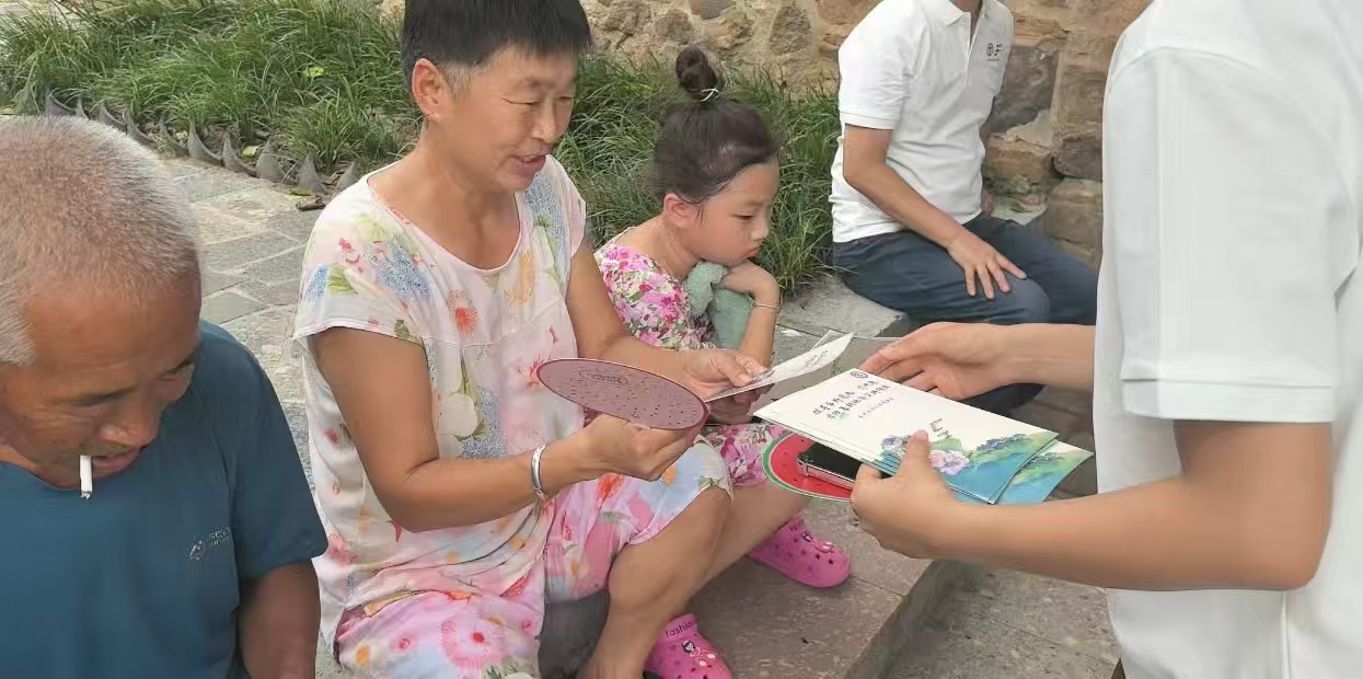 在水口村的白楊樹下,一場由實踐團主導、當地政府和村委支持的宣講活動熱鬧開場。隊員們自制宣傳冊,在宣講開始前分發給村民,圖文并茂的內容讓村民們看得入神。