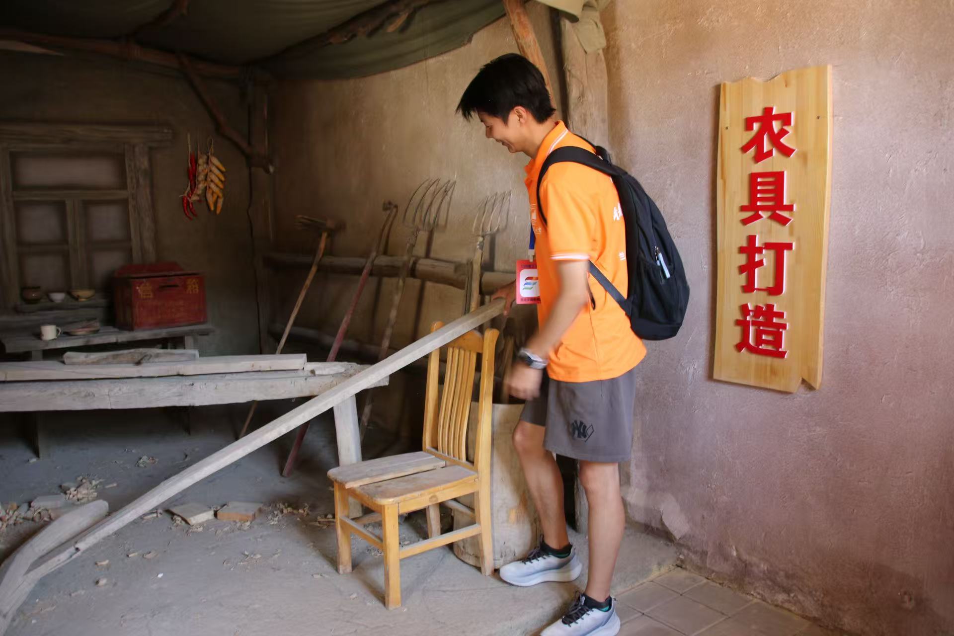圖為實踐隊員在九團八連窯洞式紀念館體驗農(nóng)具的打造。高文玉 供圖