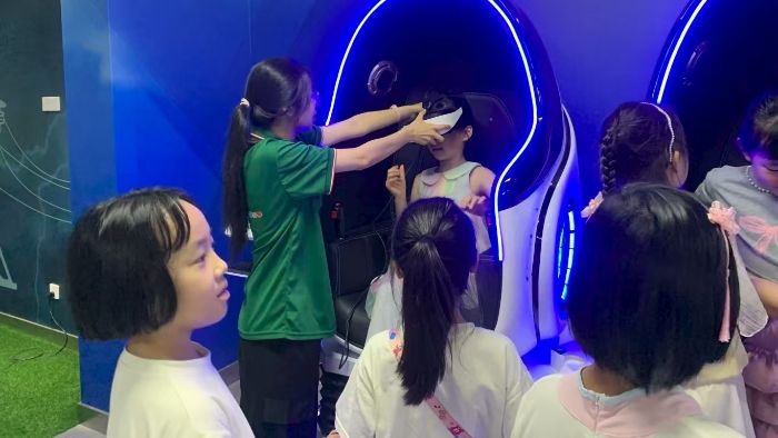 圖為“院長媽媽有約”社會實踐科普隊員幫助小朋友體驗?zāi)M天氣VR體驗。潘依琳供圖