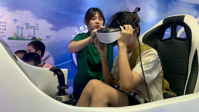 圖為“院長媽媽有約”社會實踐科普隊員幫助小朋友體驗人工影響天氣VR飛機。唐明燁供圖