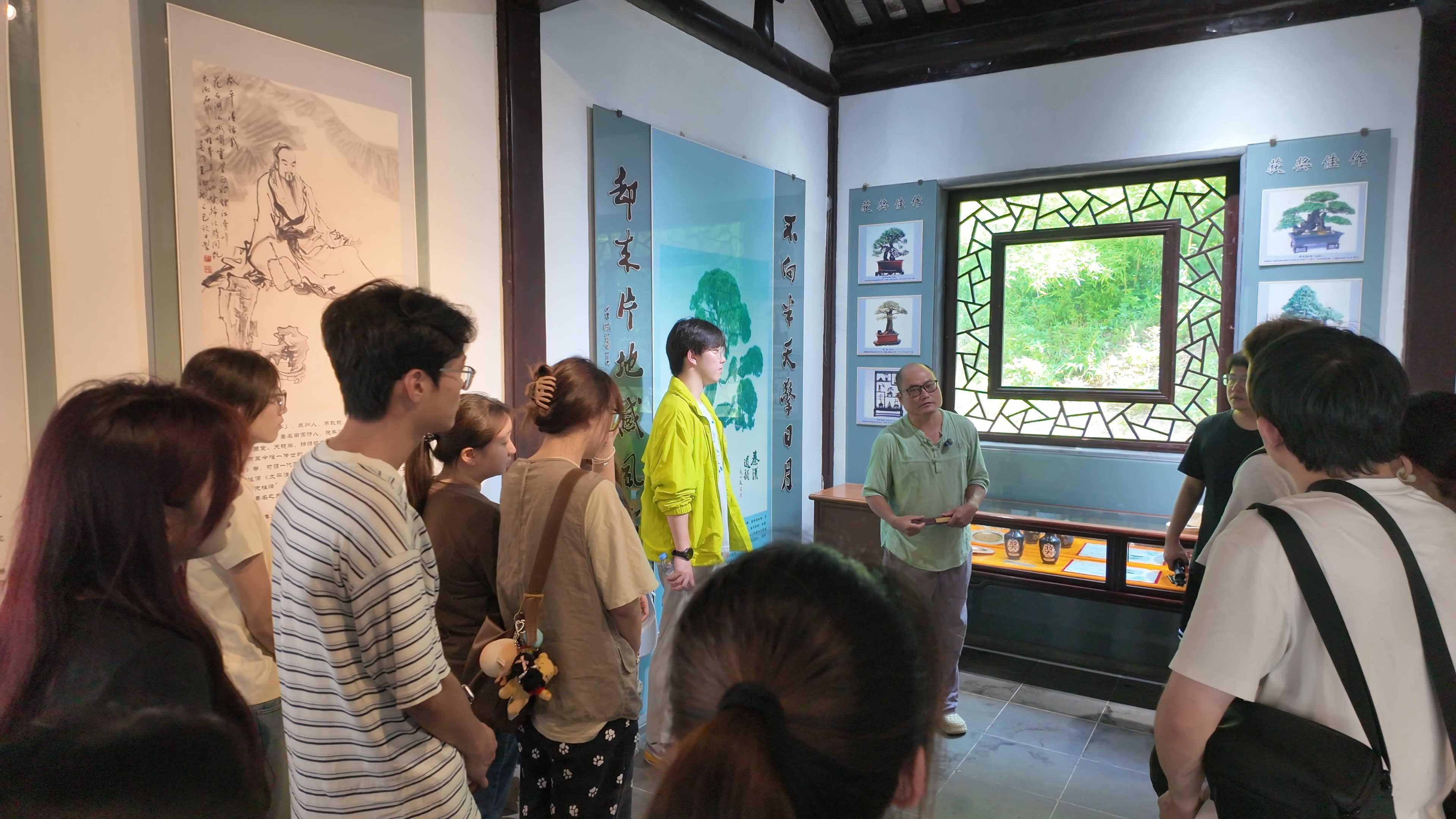 活動首站,實踐團隊來到蘇派盆景國家級非遺代表性傳承人王繼強的工作室。隊員們以“小青匠”的身份,潛心學習盆景制作技藝。王繼強老師現場演示了蘇派盆景“粗扎細剪”的獨特技法,并講述了他與盆景藝術數十年的故事。“盆景藝術不僅是手藝,更是心法,需要耐心和熱愛。”王繼強老師的一席話讓隊員們深刻體會到非遺傳承背后的匠心精神。通過訪談傳承人的學習經歷與創新思路,隊員們為后續活動打下了堅實基礎。
