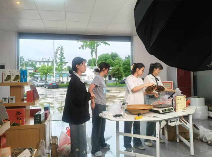 隨著直播時間的臨近,延大學子們迅速進入角色,化身“主播助理”與“助農主播”,全方位協助直播工作。有的同學細心地布置展示區域,調整燈光角度,確保每一件農產品都能清晰呈現最美的姿態;有的同學則對農產品進行仔細的整理分類,貼上對應的介紹標簽,方便展示和觀眾了解;還有的同學憑借活躍的思維,不斷給主播們提出富有創意的直播點子和互動建議,讓直播流程更加順暢有趣。