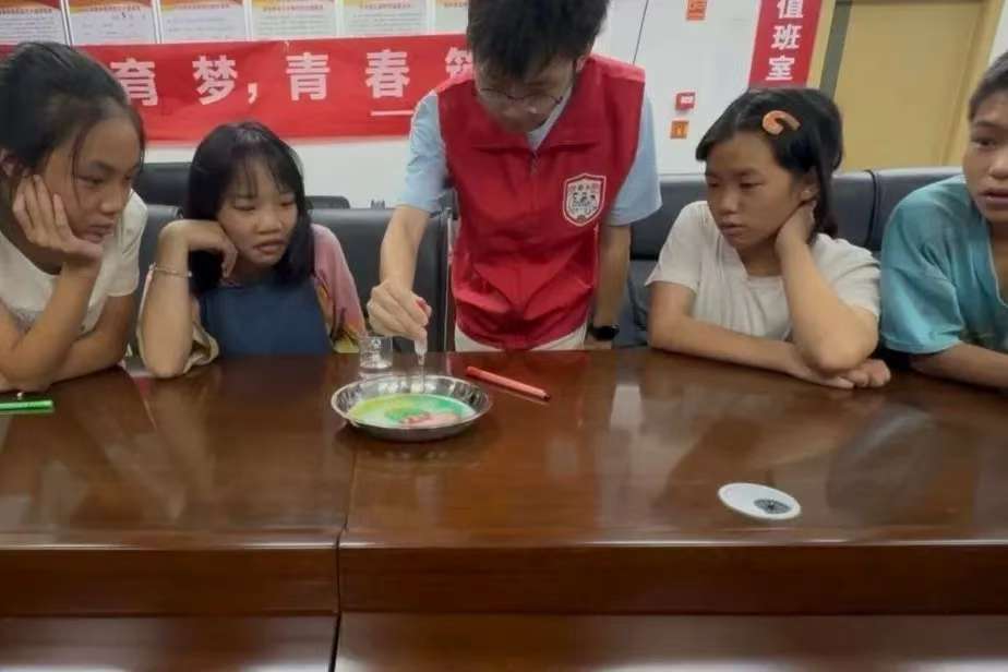 圖為實踐團成員和小朋友們一起做水中煙花實驗 吳桐 攝