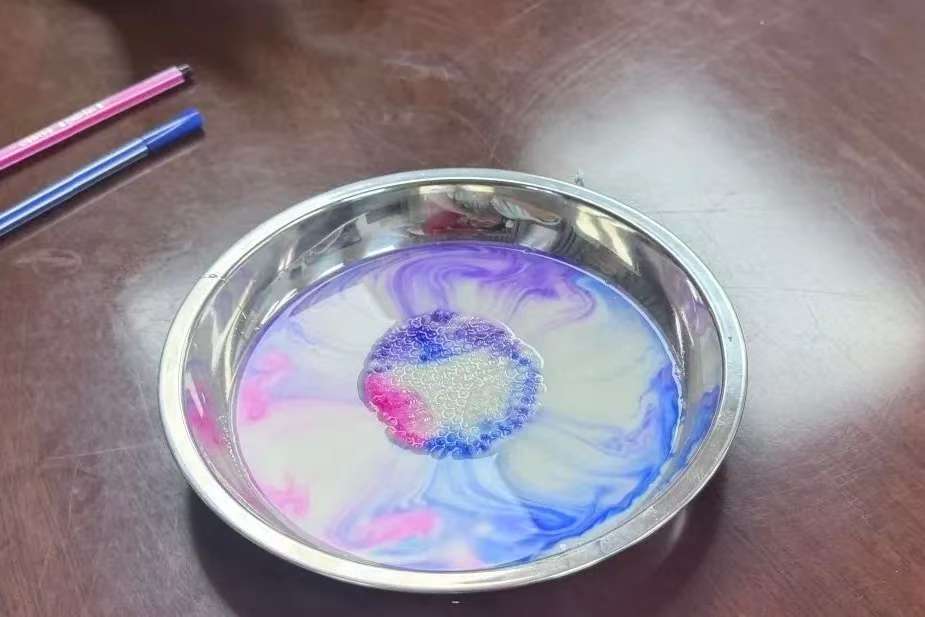 牛奶里滴上紅、黃、藍、綠、粉……多種顏料,再把蘸了洗潔精的棉簽輕輕一碰——顏料突然像炸開的煙花,在牛奶里畫出彩色的紋路,慢慢暈成一片。