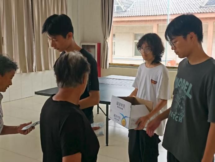 圖為實(shí)踐團(tuán)成員為老人分發(fā)飲品