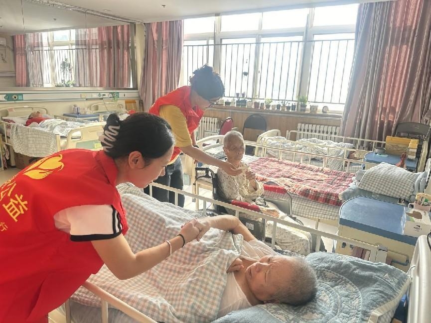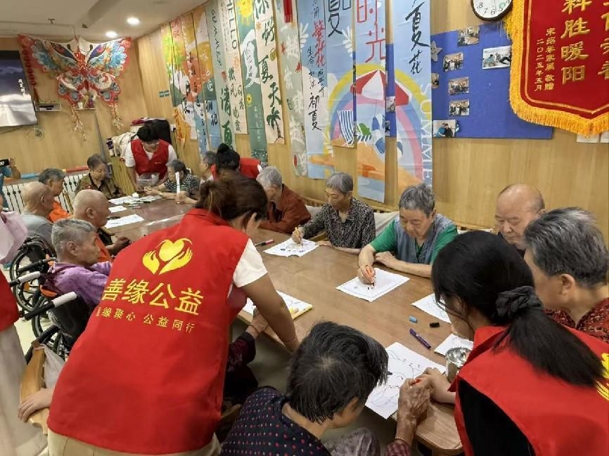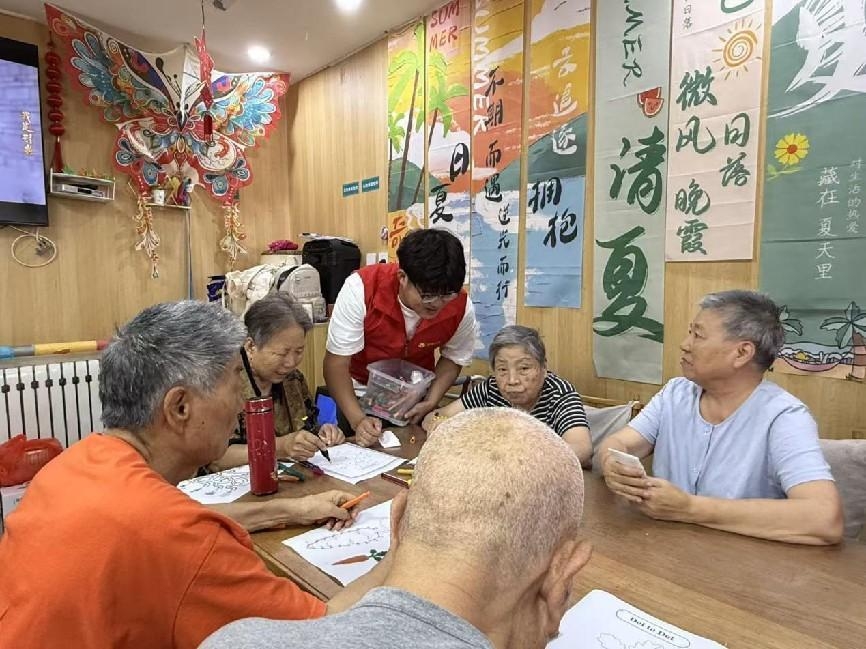 成員們把A3紙鋪成長龍,紙上印的小兔子、西紅柿、小軍艦正靜靜等待著爺爺奶奶們的連線與涂色。失能失智的奶奶握筆不穩(wěn),隊員小韓半蹲下來,右手包住奶奶的手背,左手托住奶奶的手腕,像教小學生一樣輕聲數節(jié)奏:“一、二、三——連!”黑色線條慢慢顯形,奶奶忽然咯咯笑起來:“原來是我家養(yǎng)的那只長耳朵!”那一瞬,成員小韓仿佛看見童年的她蹦蹦跳跳跑向現在。