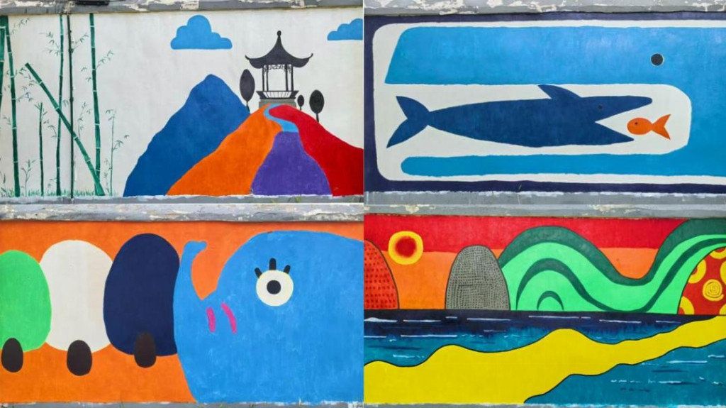 3.墻繪傳情鄉野煥彩 團隊的實踐延伸至課堂之外。成員們將環保理念融入藝術創作,精心繪制了五幅主題墻繪。成員們以斑駁墻面為畫布,將生態保護的深刻理念、鄉村美育的實踐探索與支教行動的溫暖成果熔鑄于筆墨色彩之中:翠竹搖曳、遠山含黛、古亭矗立的畫面,暈染著中國傳統美學的雅致韻味,讓鄉村文化氛圍在藝術浸潤中愈發醇厚;海洋生靈嬉戲共生的圖景將海洋生態保護的重要性娓娓道來;憨態可掬的大象與自然相融的形象,巧妙傳遞著人與自然和諧共生的美好倡議;支教師生相擁歡笑的場景被定格,成為鄉村教育振興路上閃光的記憶碎片;鋪展開來的斑斕山水畫卷,則與“綠水青山就是金山銀山”遙相呼應,生動勾勒出車門鄉生態宜居的美麗鄉村新貌。這些墻繪將成為鄉村傳播環保理念的生動載體,助力深化應對氣候變化、保護地球生態環境、促進人類社會可持續發展的實踐。