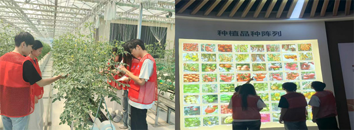細究種植實況解碼番茄基因 實踐團成員踏入西紅柿智能溫室,俯身觀察植株長勢,觸摸葉片、輕捻枝干,記錄株型、葉色等生長細節,對比不同區域植株差異,探尋環境調控與種植管理對生長的影響,并進行認真記錄,從一線種植場景挖掘產業發展根基。在種植品種陣列展區,成員們凝視多樣番茄品種展板,比對果實形態、色澤差異,追溯品種培育故事,討論不同品種的市場適配性與產業價值,從品種多樣性中剖析產業創新潛力,為產業升級攢集知識養分。