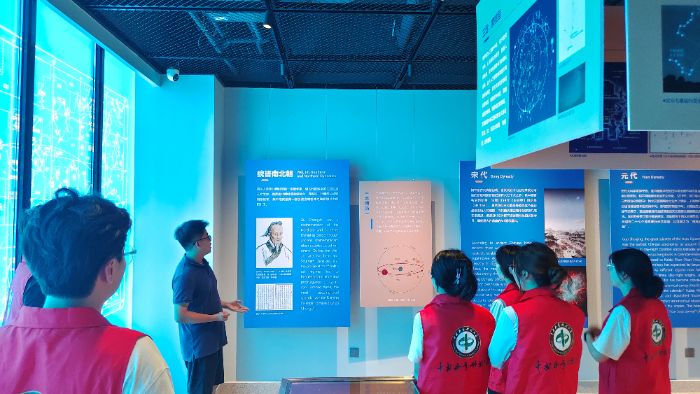 在專業(yè)講解員的帶領下,實踐團參觀了天文臺的各個功能區(qū)。講解員介紹“‘茶觀天象’金井天文臺,擁有省內最大的光學天文望遠鏡,這是目前中南五省對公眾開放的最大的天文望遠鏡,最遠可以觀測到86億光年左右的類星體。”金井天文臺門口擺放著一套橙黃色的服裝,據(jù)了解到這是前蘇聯(lián)第一次登上月球的宇航服款式,是中國早期探索高層空間時保護飛行員安全的裝備。此外,金井天文臺擁有湖南省最全面的隕石收藏,共15塊隕石。在工作人員的帶領下,實踐團成員還使用望遠鏡親自體驗了近距離觀測星系。