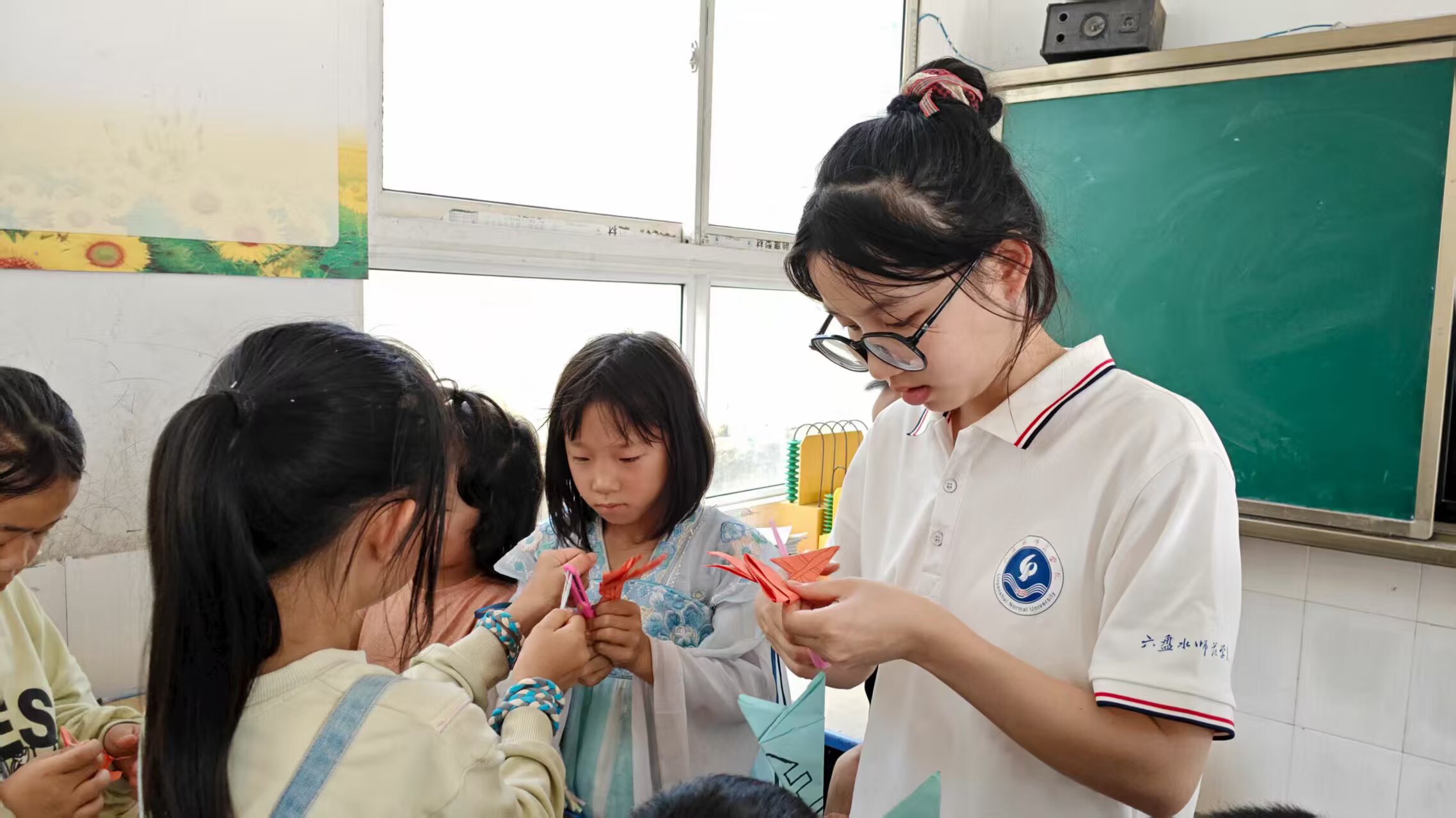 圖為手工課上,志愿者耐心指導,同學們在妙手生花的折紙課上折出了一個個精致的作品。 通訊員王靜月 攝