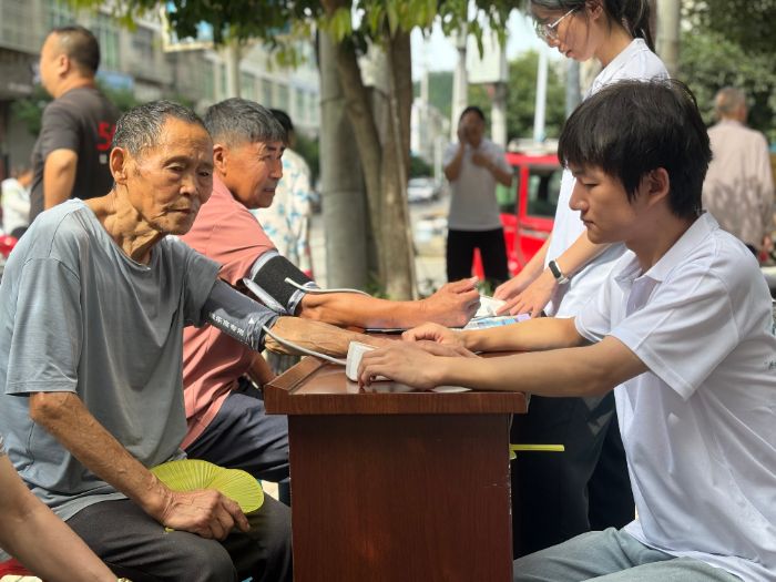 圖為團(tuán)隊(duì)成員在鎮(zhèn)上為村民測(cè)量血壓 陳丹供圖