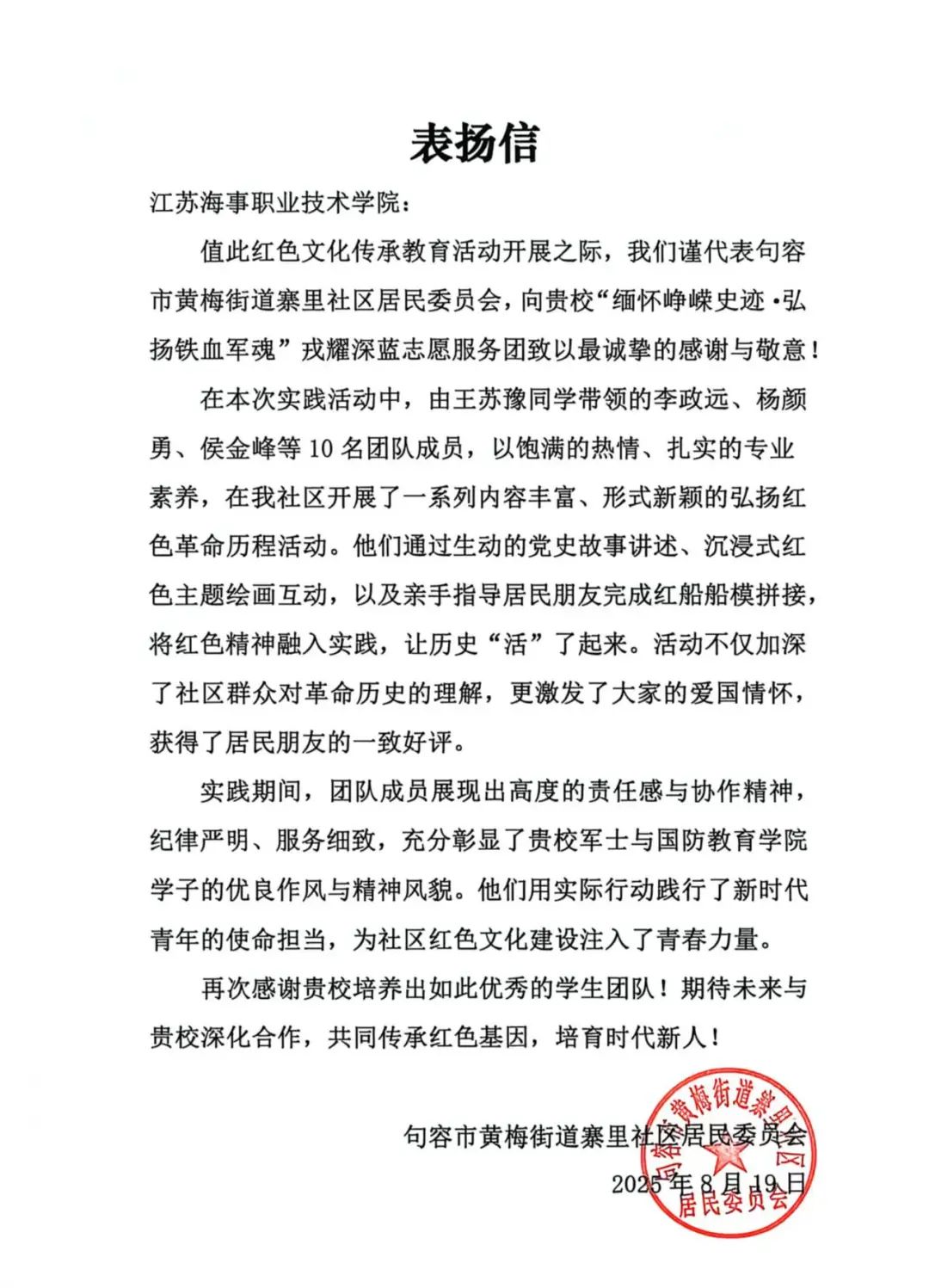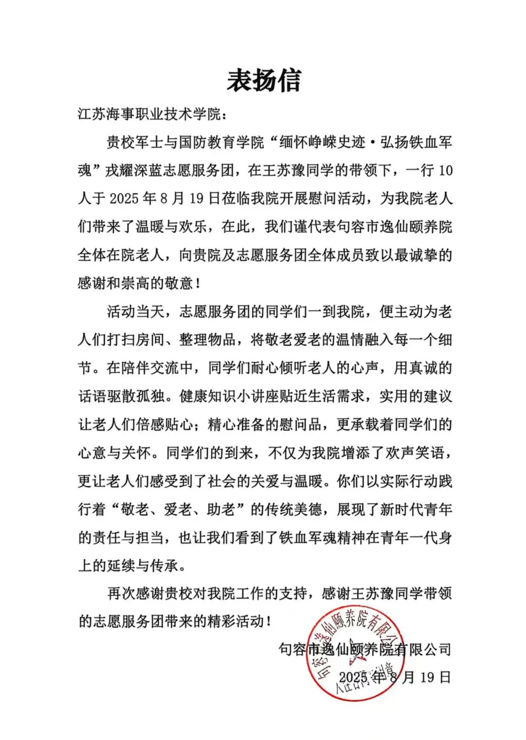 活動結束后句容市黃梅街道寨里社區居民委員會及句容市逸仙頤養院向“鐵軍薪火”戎耀深藍志愿服務隊發出表揚信。