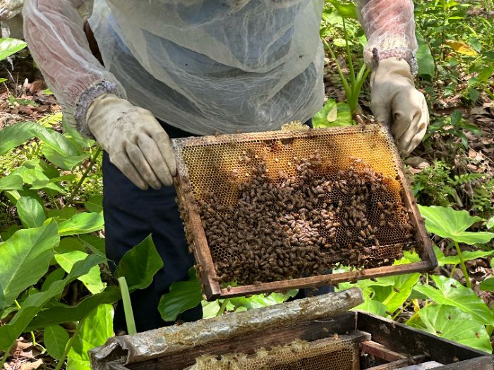 圖為蜂農袁日炳展示蜂巢蜜