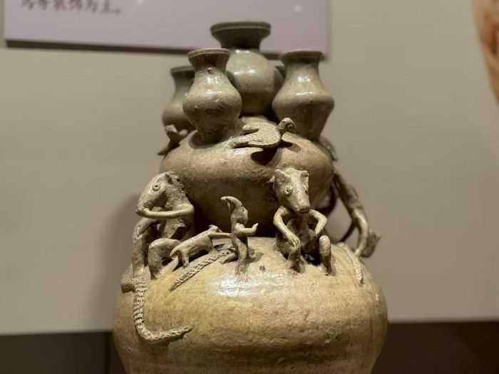 此罐體上密布著形態各異的動物與人物形象:有的侍從捧物而立,有的瑞獸昂首蹲坐,還有的樂伎吹奏樂器,熱鬧的場景仿佛在演繹一場跨越生死的儀式。該罐體上有眾多動物和人物形象,形態各異,展現了當時的喪葬文化與宗教信仰。堆塑的各種形象寓意著對死者的祝福和對來世美好生活的祈愿,營造了熱鬧的場景,也反映了當時工匠的高超技藝與豐富的想象力。