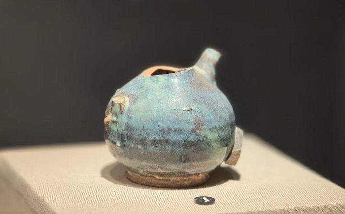 這件瓷器呈現出獨特的藍綠色,是在燒制過程中窯內溫度發生變化,釉料中的金屬氧化物發生復雜的化學反應而成,造型小巧,可能是用于傾倒液體的生活器具。