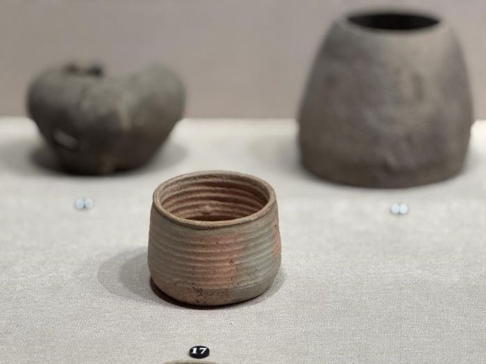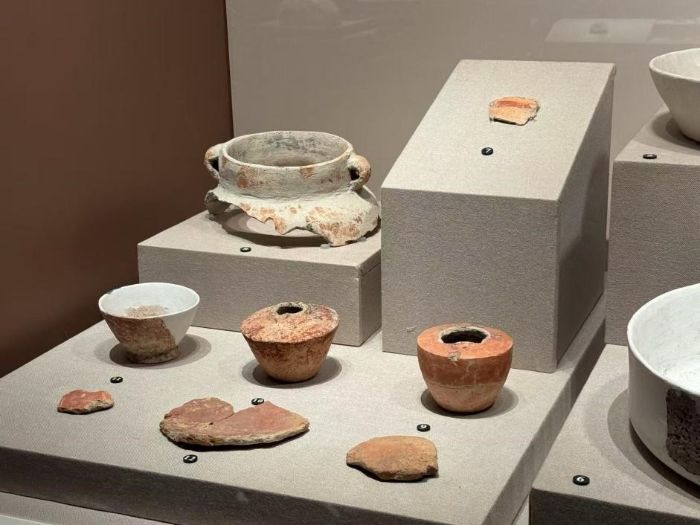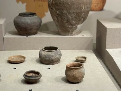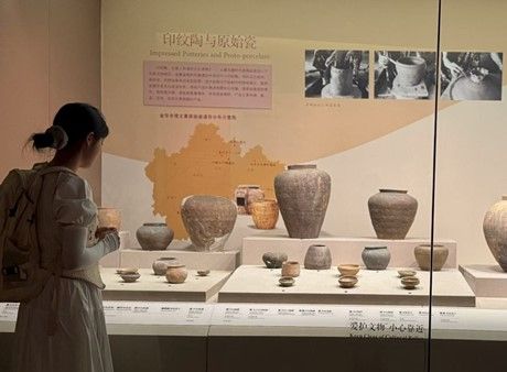 上山文化出土的陶器多為“夾碳紅衣陶”,火候低,質地疏松,器型簡單,與古老的年代相吻合。制陶工藝以原始的“泥片貼筑、泥條拼接”為主,旁邊有用手觸摸感受陶器紋理與拼接還原瓷器的互動環節,用雙手感受近萬年智慧的沉淀。