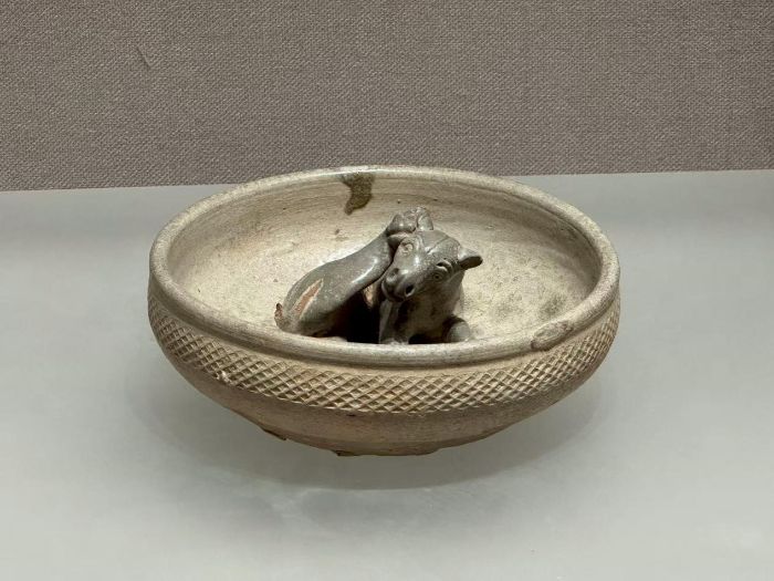 青釉瓷狗圈,西晉文物淺腹斜收,平底,內底捏塑有一只用后爪往頭部撓癢姿態的狗,憨態可掬。小狗的毛發紋理、肢體動態被刻畫得細致入微,既反映了兩漢六朝時期厚葬習俗下“明器仿制現世財富”的風尚,更讓千年前的生活場景躍然眼前。它不僅是實用與藝術的結合,更是古人“事死如事生”觀念的鮮活物證。