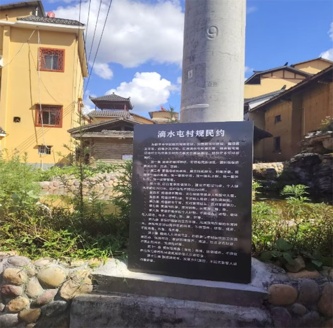 滴水村:仿制石牌前,老智慧的新表達 離開平孟村,實踐團來到滴水村。村口的廣場上,一塊嶄新的“石牌”格外醒目——“愛護山林”“和睦鄉鄰”等字樣清晰陳列。這不是老石碑,是當今仿制的新石牌律,上面寫著滴水村的村規民約。但實踐團發現,在傳統習慣法與當代法治銜接的過程中,遇到了將禁止性條款簡單轉化為倡導性條款的問題,從而使得村規民約缺乏可執行性。