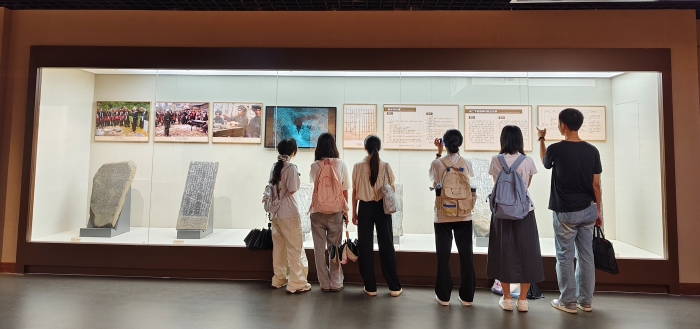 圖3:實(shí)踐隊(duì)在金秀瑤族自治縣瑤族博物館里對(duì)瑤族石牌進(jìn)行研究分析