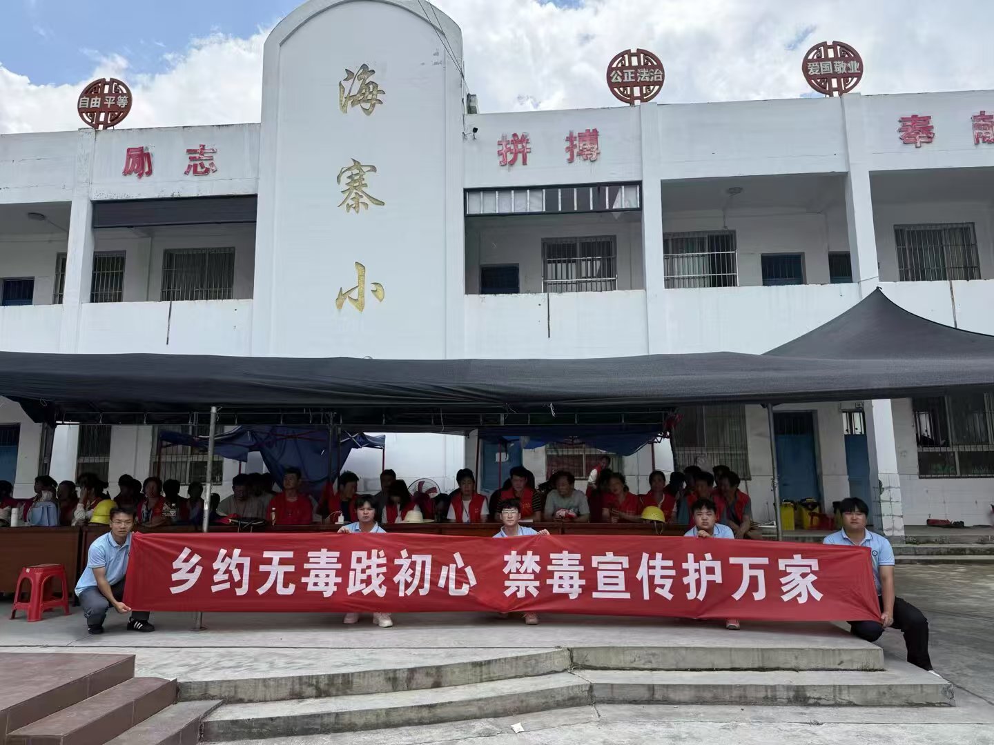 圖為咋子海寨小學的操場上,陽光鋪灑在水泥地面上,映著幾分熱鬧的光影。村民們三三兩兩地聚攏過來,有的帶著孩子,有的搬來小板凳坐下,目光落在隊員們手中的宣傳冊和展板上。隊員們則穿梭在人群中,用樸實的話語講解著毒品的種類與危害,時而拿起模型比劃,時而回應著村民的疑問,原本空曠的操場,因這場貼近民心的禁毒宣傳,變得格外溫暖而充實。