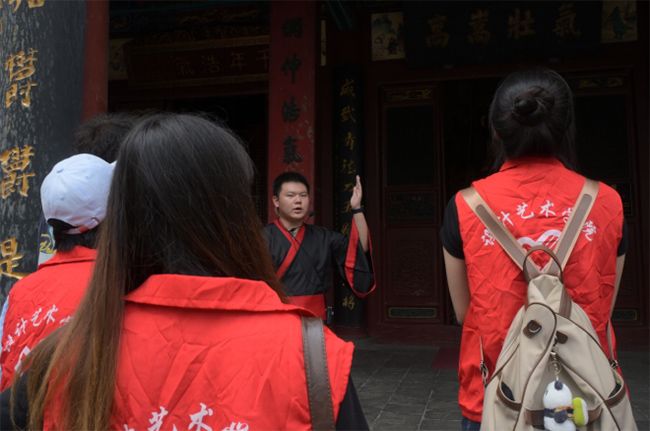 實踐當天,隊員們跟隨講解員的步伐沿中軸線參觀了解關林整體布局,深入了解了武圣關羽的生平事跡和關林廟的歷史文化。作為中國唯一冢、廟、林三祀合一的古代經典建筑群,關林廟擁有豐富的古建筑、碑刻、祭祀習俗等物質與非物質文化遺產,為文創設計提供了大量創作素材。隊員們仔細觀摩每一處建筑細節,記錄匾額題字,研究碑刻藝術,感受著這座圣地帶給人們的文化震撼。
