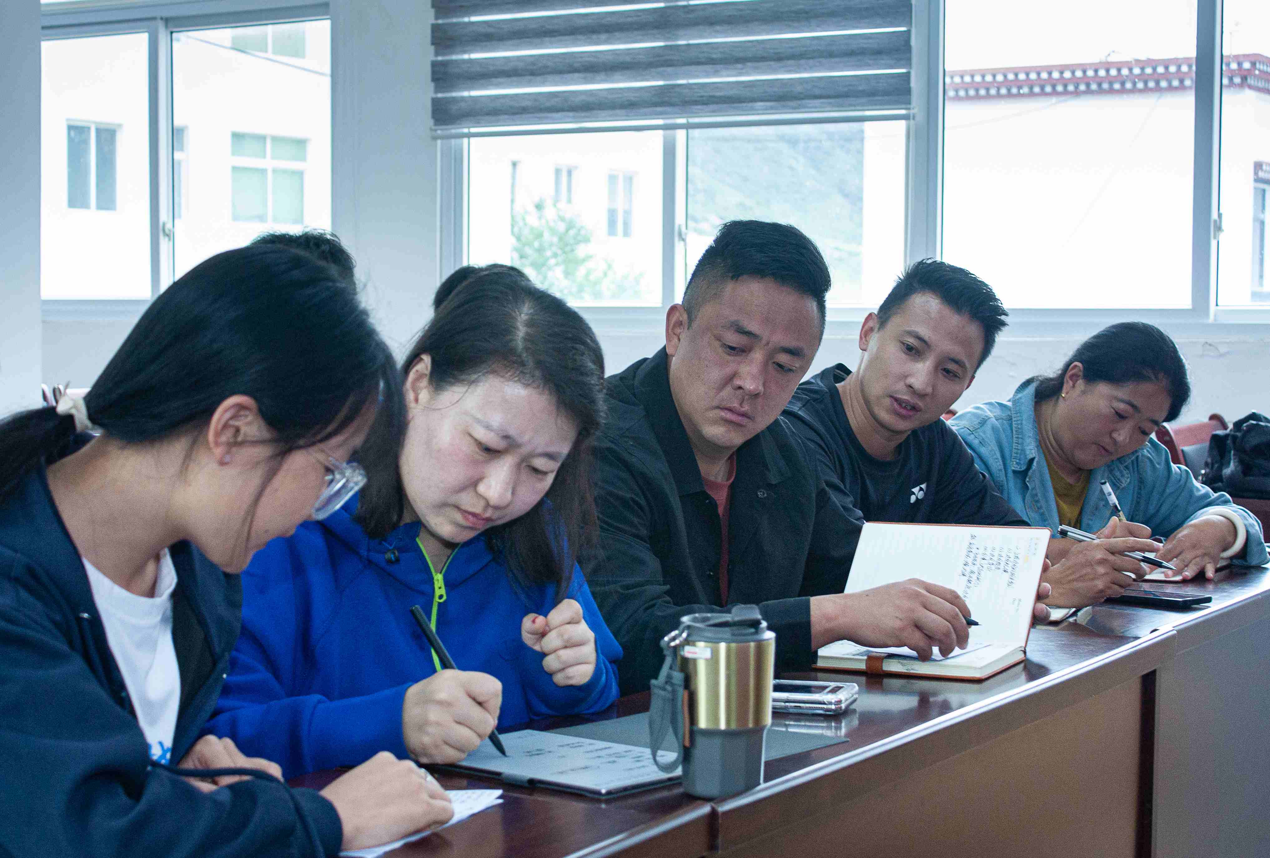 圖為推普小隊隊員向鎮政府相關領導講解創作思路。前排左一為香巴拉鎮黨委書記尼慶禛。圖為王律皓 供圖