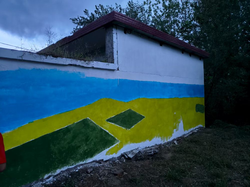 次日一早,實踐團成員早早集合,延續高效協作模式,集中精力推進整體繪畫。成員們默契配合,精準把控畫面構圖與色彩基調,將生態元素與鄉村景致的融合度進一步提升,快速完成了剩余墻面的整體繪制,為后續細節優化打下堅實基礎。