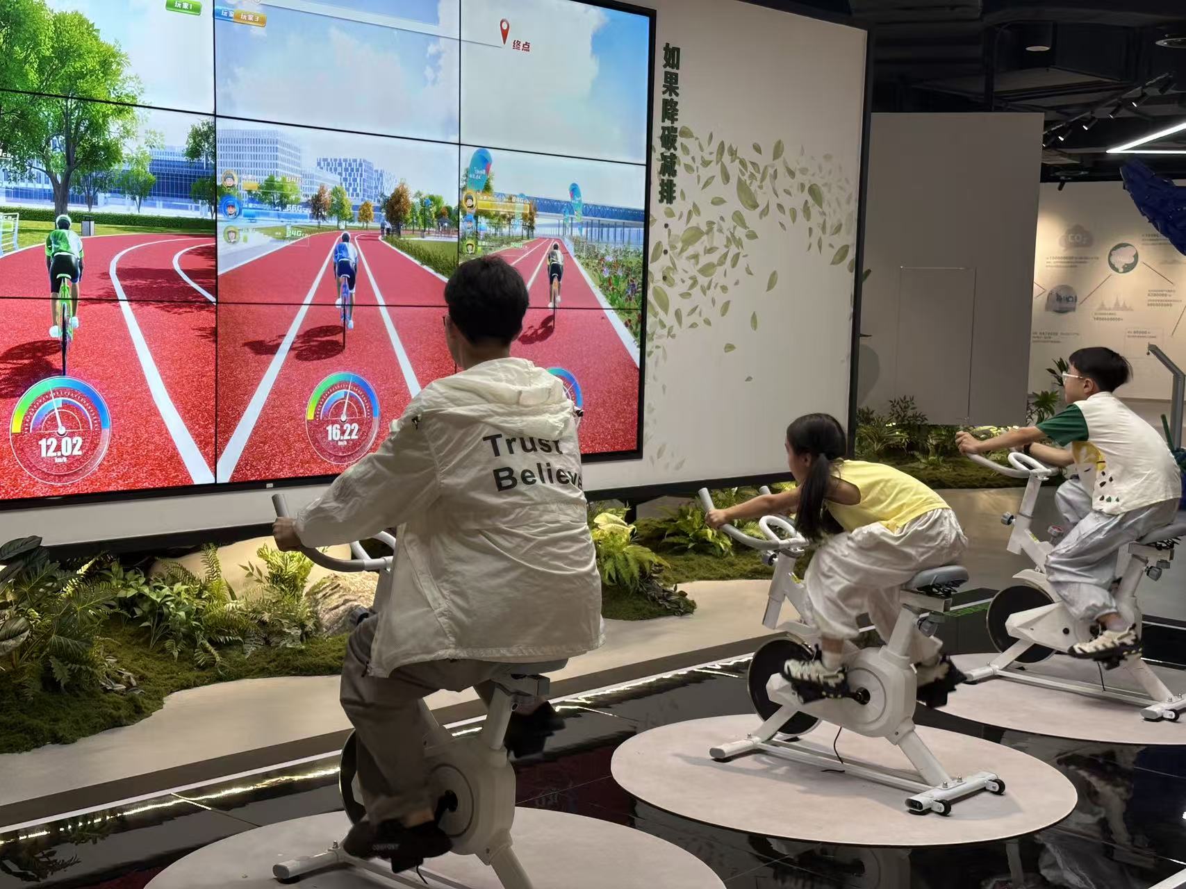 “低碳出行模擬區”里,成員們對比了傳統燃油車與新能源汽車的能耗差異,通過模擬自行車,感受低碳出行對于減排的意義。