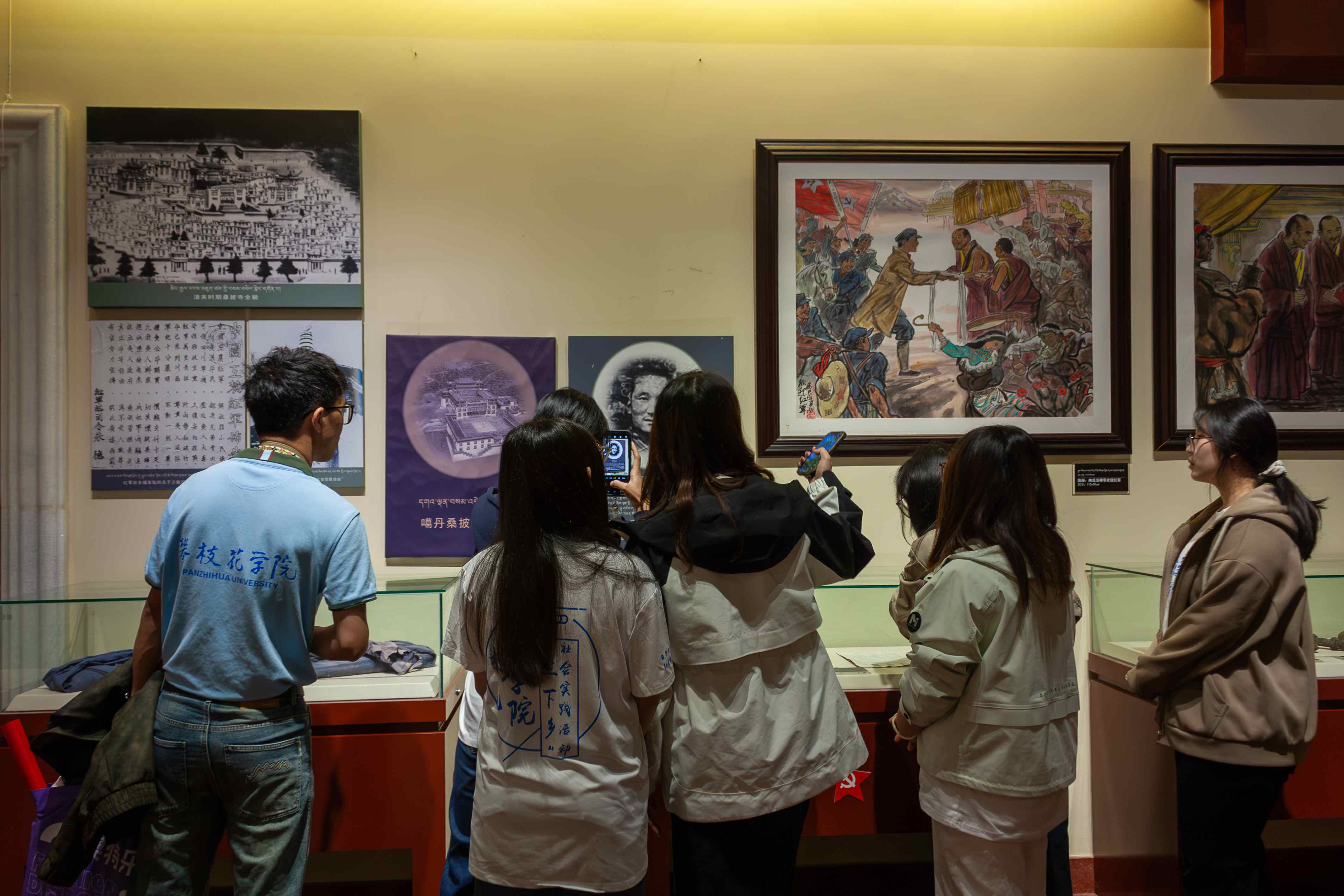 木棉傳語推普小隊前往鄉城縣紅軍紀念館開展參觀學習活動,重溫紅色歷史,感悟軍民情誼。在紀念館內,小隊成員們重點參觀了展現鄉城人民迎接與歡送中國工農紅軍第六軍團的場景圖,直觀感受了當年紅軍過境時軍民互動的溫暖畫面。同時,大家還近距離觀摩了紅軍使用過的馬鞍、軍裝、綁腿等生活用品,以及槍、大炮等武器裝備,還有書具、時報等歷史文獻,這些實物與史料生動還原了紅軍當年的生活與戰斗風貌。