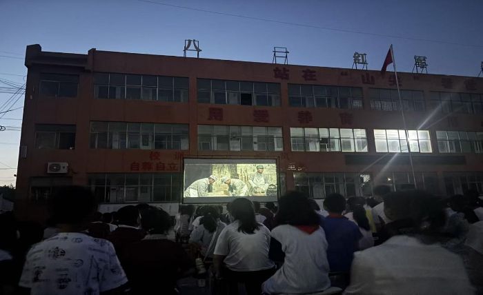 夜幕悄然籠罩伏羲山學(xué)校的操場,幾盞照明燈勾勒出露天觀影區(qū)的輪廓。晚上,一場紅色電影在此如約放映。幕布亮起,革命先輩們?yōu)槔硐胄拍钇床珚^斗的畫面在夜空中鋪展,孩子們坐在小板凳上,眼睛里閃爍著專注的光芒。紅色光影不僅照亮了秋夜的校園,更在孩子們心底播撒下對家國情懷、英雄精神的崇敬火種,讓這一天的校園生活,在溫暖與感動之外,又多了份莊重與力量的浸潤。