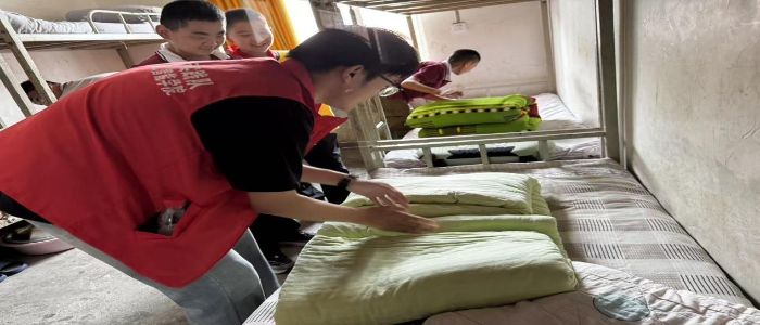 訓(xùn)練結(jié)束后,隊(duì)員們又帶著孩子們學(xué)習(xí)內(nèi)務(wù)整理。從疊“豆腐塊”被子開(kāi)始,隊(duì)員們蹲在宿舍床邊,反復(fù)示范折疊的角度與手法,孩子們圍在一旁認(rèn)真模仿,當(dāng)松散的被子在自己手中變得方方正正時(shí),小臉上滿是成就感的光芒。