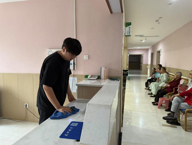 (圖為實踐團郭子坤幫助護理人員打掃衛(wèi)生)