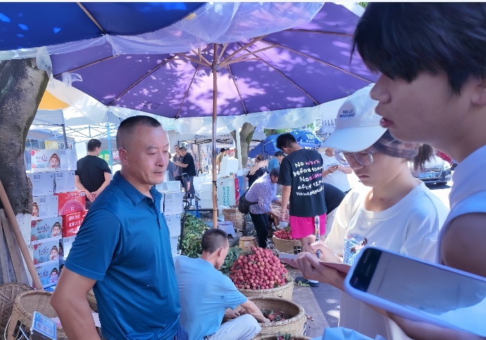 團隊抵達荔江鎮初步實地調研當地荔枝樹的生長態勢及豐產性后,采訪了返鄉創業的袁海通先生,他談及創業背景和創業歷程,銷售方面采取“引進來”和“走出去”模式,并逐漸做人才孵化,整合力量做品牌建設。他強調當前市場競爭激烈,農產品銷售要重視品質與服務,培養消費者消費習慣和層次。讓團隊認識到大學生應注重綜合能力培養,在實踐中積累經驗。