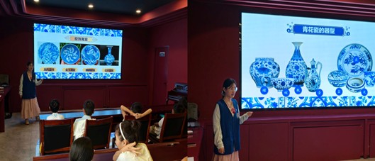 紋樣探秘,青花啟蒙 活動伊始,實踐團成員展示青花瓷圖片,以生動比喻講解花藍白配色、纏枝紋等典型元素:將藍白配色比作“藍天映白云”,把纏枝紋形容為“永不斷開的藤蔓”,幫助小朋友理解青花之美。簡單易懂的講解,讓孩子們快速走近傳統文化,激發了創作興趣。