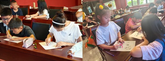 展評留影,傳承印記 作品完成后,孩子們的畫作被精心貼成“青花瓷展”,他們興奮地介紹自己的設計理念。最后實踐團成員與孩子們合影留念,定格下充滿成就感的瞬間。