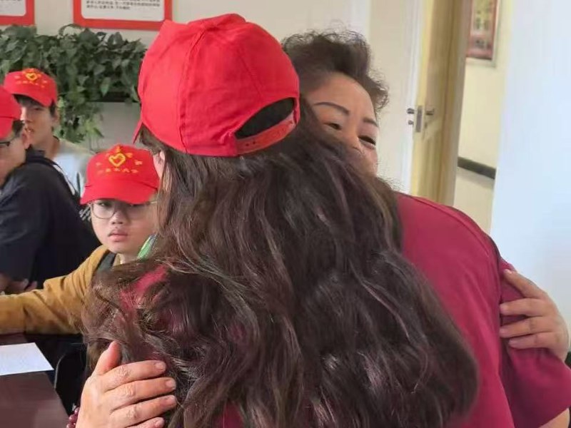 志愿者們為促進民族團結,了解模范故事大家一起坐在長桌前相談甚歡,到最后民族先進模范與志愿者擁抱表示對模范的尊敬。