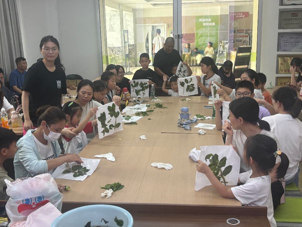 拓印傳香:指尖生花,定格草木靈韻 “中草藥拓印”實踐體驗是一場視覺與嗅覺的雙重奇遇,也是本次“七彩假期”活動中的一大亮點。孩子們在志愿團成員的耐心指引下,依次完成選材→墊布→捶打→揭膜四步工序:精心選取完整葉片置于帆布袋內,覆蓋棉布后用木槌均勻敲擊,使葉脈紋理逐漸滲透至布料。在這個過程中,孩子們化身小小采藥人,在琳瑯滿目的藥草間細細挑選:舒展如扇的銀杏葉、香韻沁脾的薄荷、艷若丹霞的藏紅花……這些天然的“畫筆”在孩子們手中綻放出別樣的光彩。當稚嫩的小手輕執小錘,在帆布上細細敲打時,葉片的脈絡便如密碼般悄然浮現,草木的紋理似詩行般優雅鋪展,連帶著清冽的藥香也悄悄鉆進布料的纖維里。家長們也被這充滿樂趣的活動所吸引,紛紛俯身加入這場“自然創作”,指尖的溫度與草木的靈氣在捶打中完美交融,共同繪制出一幅幅獨特的中醫藥文化畫卷。