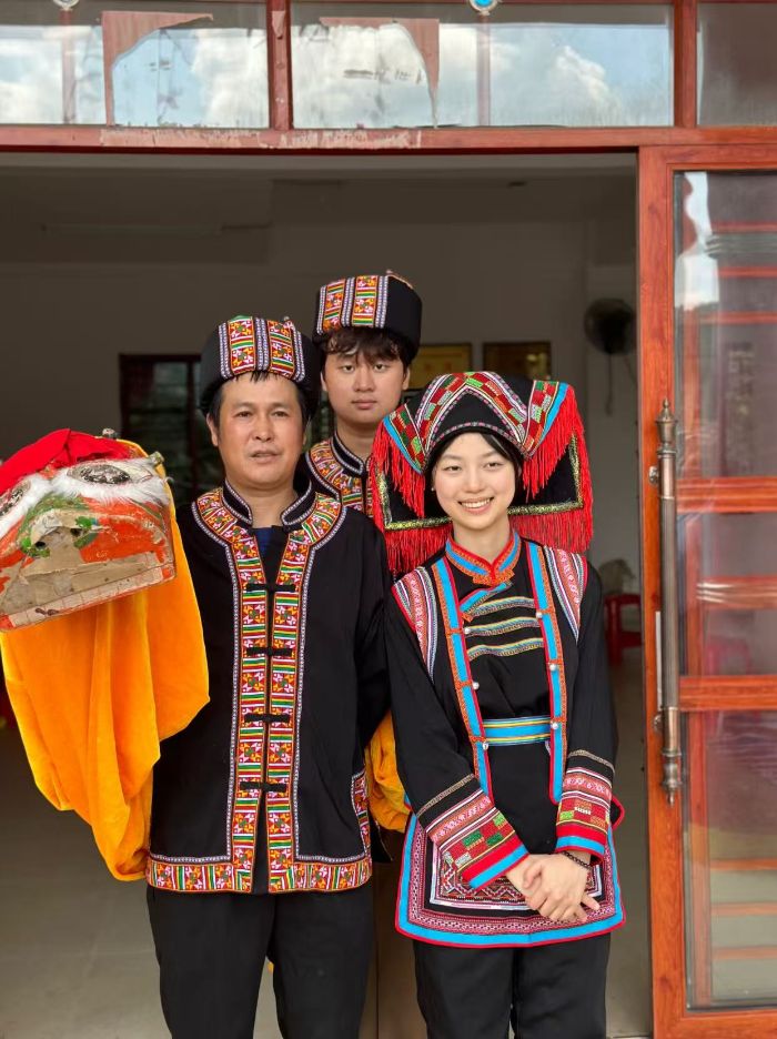 圖為隊(duì)員們穿上瑤族服飾與傳承人高老師學(xué)習(xí)木舞獅的合照 林嫻攝