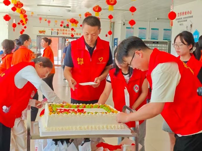 在社區食堂區域,掛滿了喜慶的紅燈籠,志愿者們圍繞著大蛋糕忙碌。他們小心切分蛋糕,將一塊塊承載著關懷的蛋糕遞到老人手中。現場氛圍溫馨,老人們品嘗著甜蜜,臉上洋溢著幸福。同時,志愿者還與老人聊天,了解他們的生活需求,傳遞溫暖與陪伴。