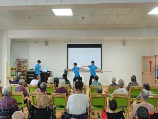 (圖為團(tuán)隊(duì)成員為老人們進(jìn)行節(jié)目表演)