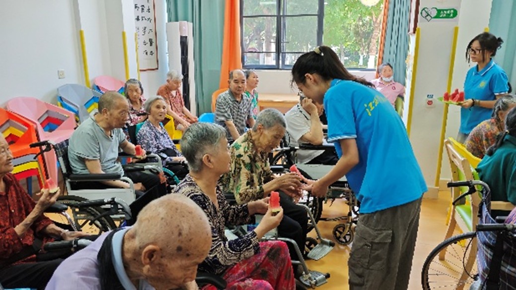 表演結(jié)束后,同學(xué)們抱著清甜多汁的西瓜,切成小塊雙手遞到老人手中。老人們接過(guò)西瓜,臉上笑成了花,咬上一口,清甜在舌尖散開,幸福也在席間流淌。有的老人拉著同學(xué)的手,念叨著“這瓜真甜”,簡(jiǎn)單話語(yǔ)滿是認(rèn)可;還有老人主動(dòng)和大家嘮起家常,把活動(dòng)氛圍烘托得愈發(fā)暖融。