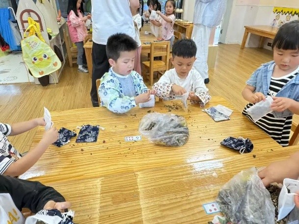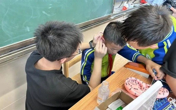 動手實(shí)踐環(huán)節(jié)將活動推向高潮。孩子們在實(shí)踐團(tuán)指導(dǎo)下制作了蘊(yùn)含草本芳香的中藥香囊。此外小學(xué)的同學(xué)還體驗(yàn)了“耳穴埋籽”,感受中醫(yī)外治法的奇妙;幼兒園的小朋友則通過趣味中藥拼圖游戲,認(rèn)識了蒺藜、青葙子等具有明目功效的藥用植物,在玩耍間加深了對中藥的認(rèn)知。