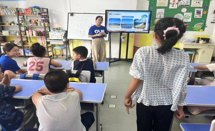 8月26日,首場宣講在春光山色社區隆重舉行。課程以“探索海洋奧秘、守護藍色未來、共讀海洋成就、共創藍色明天”四大板塊為主線,系統而生動地展現了海洋的自然奇觀、生態價值、科技前沿與人文關懷。志愿者通過精美的圖文展示、精彩的視頻資料與形象的模擬實驗,為孩子們深入淺出地講解了洋流、潮汐等海洋現象的形成機制及其對全球氣候系統的調節作用,介紹了螢火蟲魷、僧帽水母和光瞼鯛等深海發光生物的發光原理與生存智慧,極大地激發了孩子們對海洋世界的好奇心。