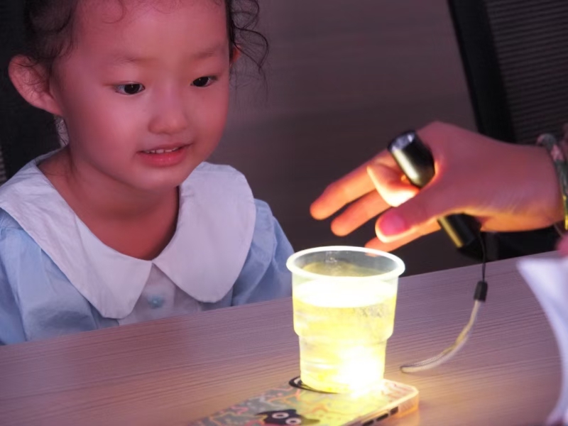 在趣味實驗環節,成員高希尚以維生素B₂、紫光燈等材料模擬“熒光流星雨”,孩子們在“理論+演示+實操”中親身體驗科學的神奇。熒光亮起的瞬間,現場驚嘆不斷,科學的種子悄然播撒心間。